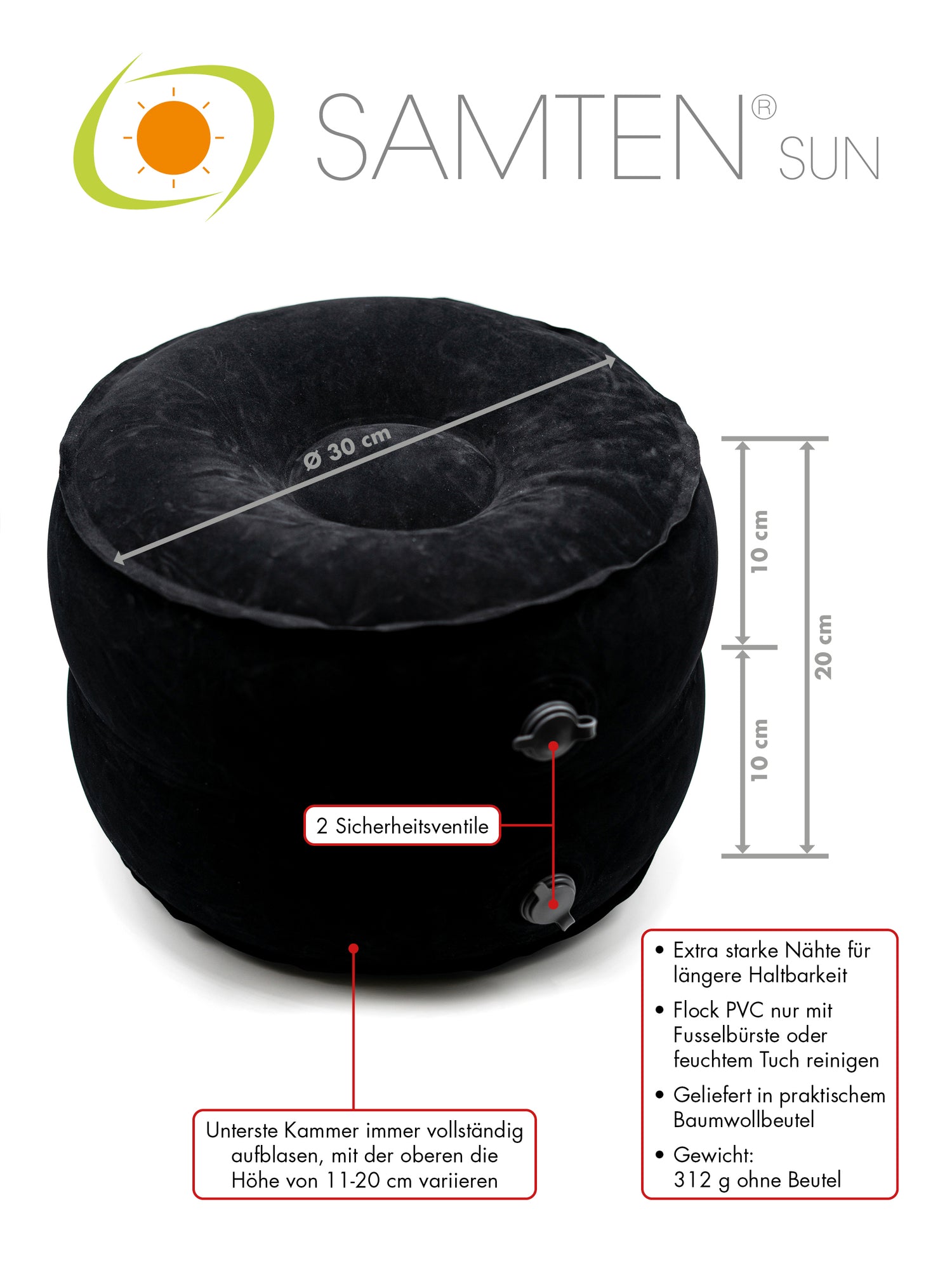 SAMTEN SUN NEU SCHWARZ - DAS RUNDE, AUFBLASBARE REISE-MEDITATIONSKISSEN NUR 312G, YOGA ZAFU, KAPOK - Schwarz