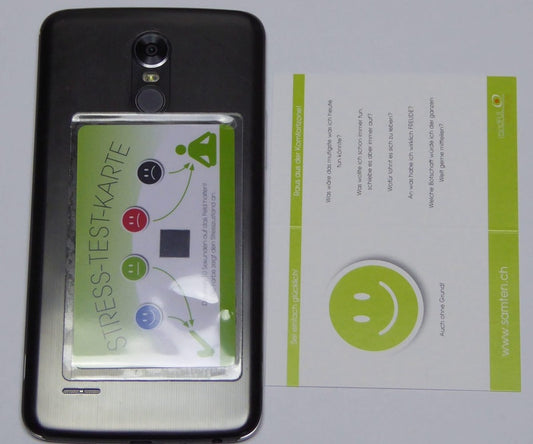 SET MIT 4 STRESSTEST KARTEN; 2 SMARTPHONE-AUFKLEBETASCHEN, ACHTSAMKEITSFALTKARTE